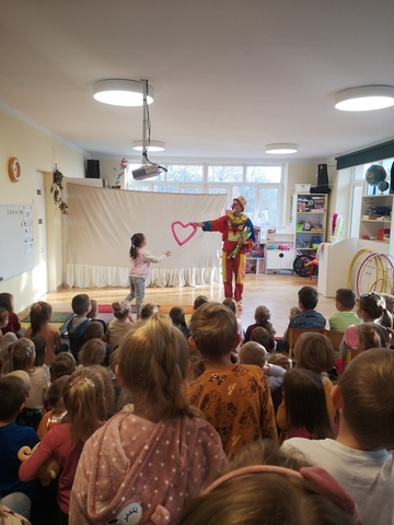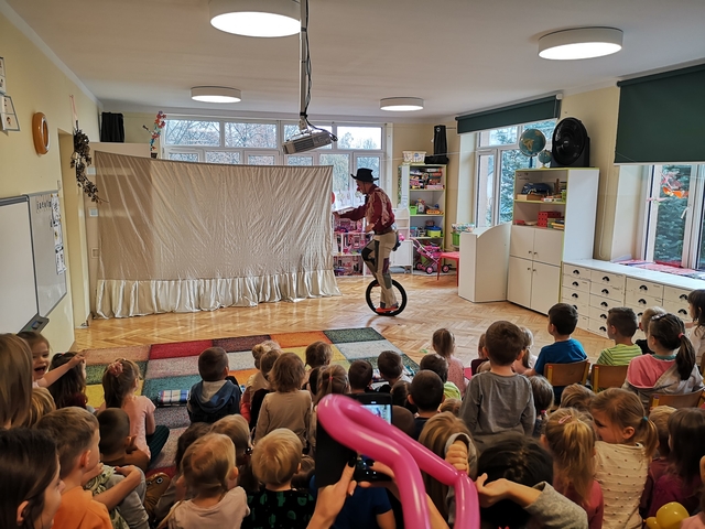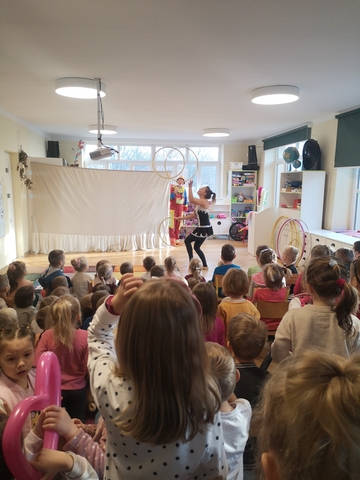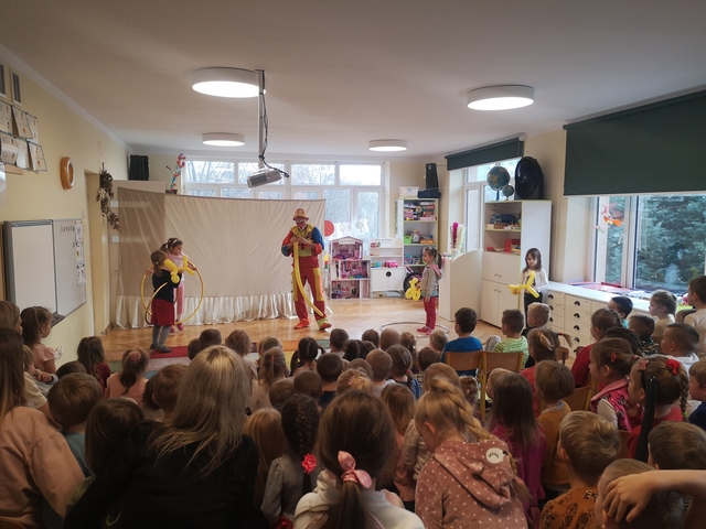 Dzieciaki z prawdziwym podziwem i zaciekawieniem oglądały popis wielu cyrkowych sztuczek, w tym żonglerki piłeczkami, akrobacje obręczami hula-hop. Występ cyrkowy umilał clown, który w pewnym momencie wyczarował prawdziwego królika.
