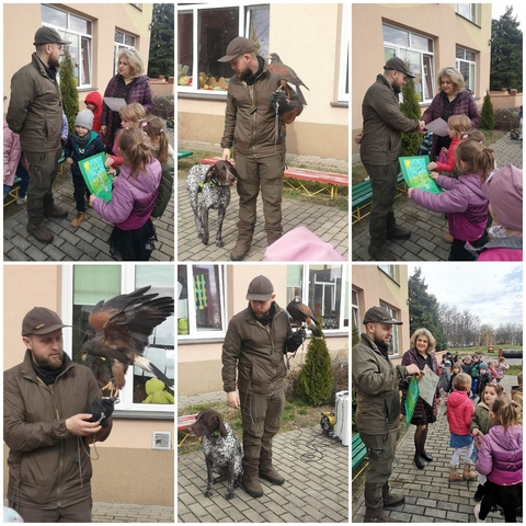 Celem tego spotkania było zapoznanie dzieci z pracą leśnika. Nasz gość przyszedł wraz ze swoim fantastycznym psem Ozi. Leśniczy opowiedział, dzieciom o zwierzętach występujących w lesie, oraz w jaki sposób pomaga im przetrwać zimę. Opowiedział również o sadzeniu lasu, przypomniał roślinność występującą w lesie, oraz poszerzył nasze wiadomości o ochronie drzew przed szkodnikami. Przypomniał, jak należy zachowywać się w lesie. Dzieci z dużym zainteresowaniem słuchały tych opowieści, a na zakończenie spotkania miały wspaniałą niespodziankę. Pan leśniczy pokazał dzieciom prawdziwego jastrzębia amerykańskiego. Spotkanie upłynęło w miłej atmosferze, a wysłuchane ciekawostki i wiadomości poszerzyły wiedzę przyrodniczą przedszkolaków.