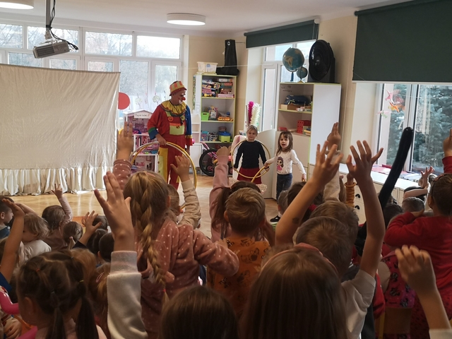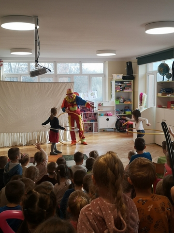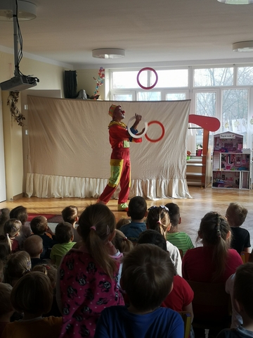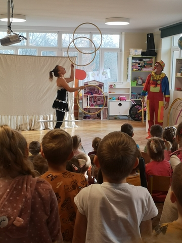Dzieciaki z prawdziwym podziwem i zaciekawieniem oglądały popis wielu cyrkowych sztuczek, w tym żonglerki piłeczkami, akrobacje obręczami hula-hop. Występ cyrkowy umilał clown, który w pewnym momencie wyczarował prawdziwego królika.